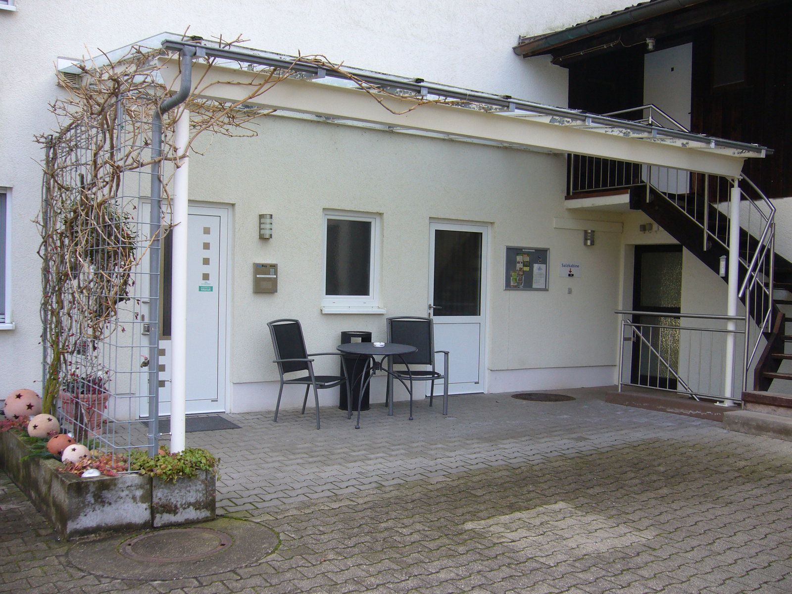 - Ferienwohnung Nr. 4: Auf dem Hof unter dem Glasdach - rechts die Holztreppe hoch.