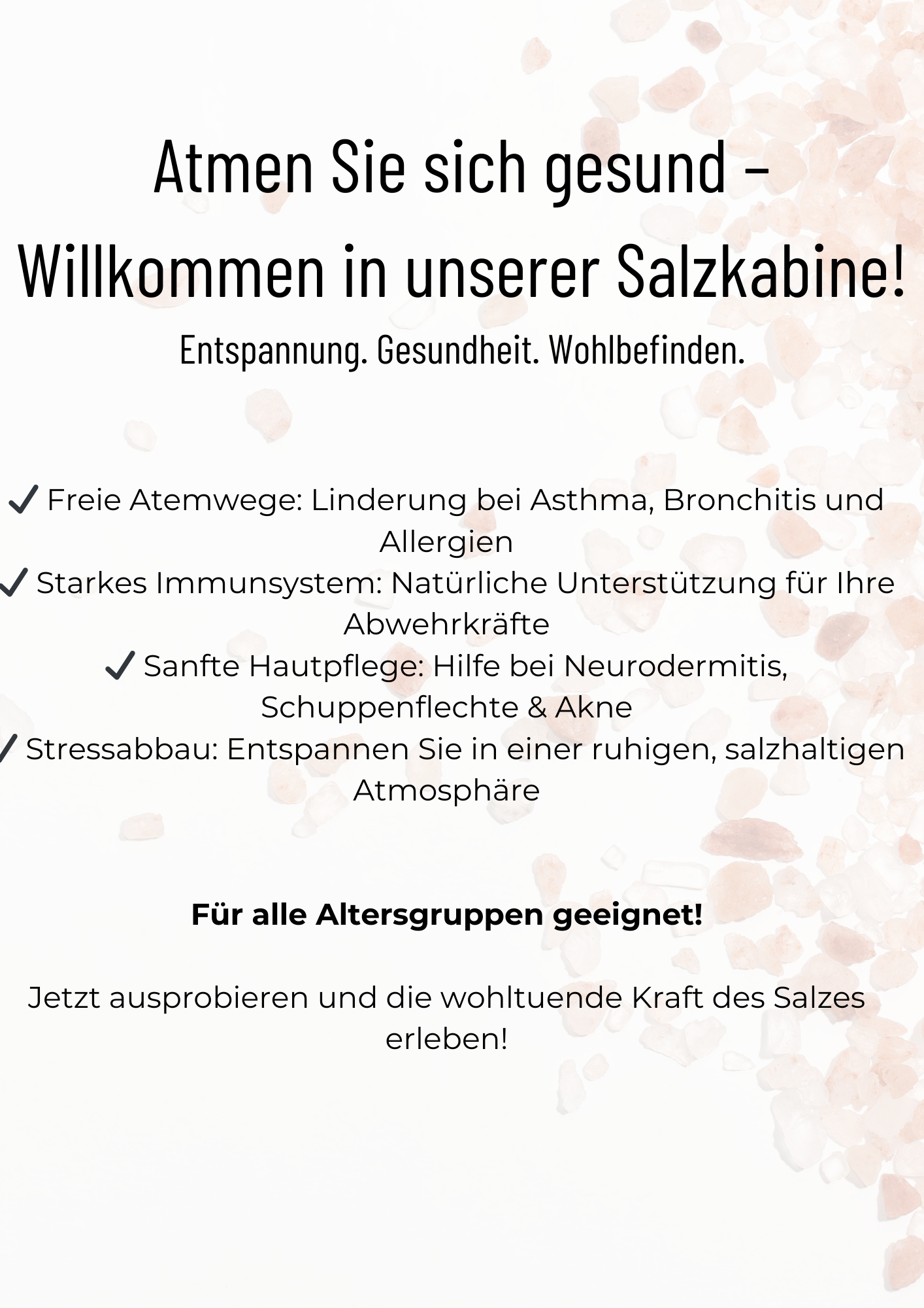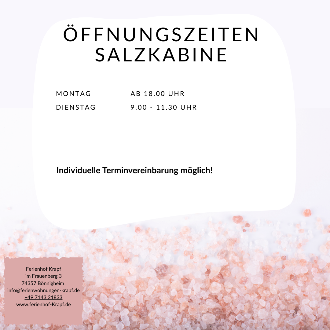 wir freuen uns, Ihnen unsere Salzkabine vorstellen zu dürfen – ein Ort, an dem Gesundheit, Wohlbefinden und Entspannung Hand in Hand gehen.